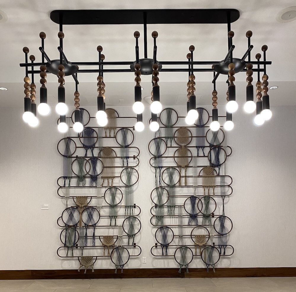 The commons bar provides a dynamic gathering place for visitors to Denver as well as residents attending one of the many conferences hosted at the Sheraton. Designers brought in copper and applied it to a suspended framework with glass panels that are angled to reflect light in a way that appears almost faceted.